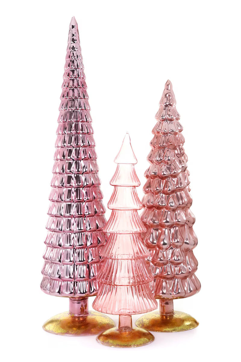 That dusty rose everyone wants, holiday-ready. This Cody Foster glass tree set in soft rose hues brings that coveted mercury glass glow to mantels, consoles, and shelves. Available in two bundles: a 5-piece set with coordinating sizes (7.5" to 17") or an extra large 3 piece set for dramatic impact (15" to 24"). Pre-styled for you. Gift it or keep it. Limited seasonal availability.
