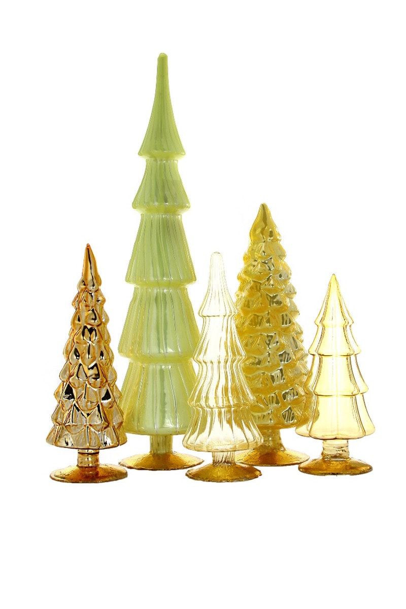 Cheerful yellow, elevated. This Cody Foster glass tree set in cheerful yellow brings unexpected brightness to your holiday decor. Includes 5 coordinating sizes (7.5" to 17") . The collected-over-time look, curated for you. Gift it or keep it. Limited seasonal availability.